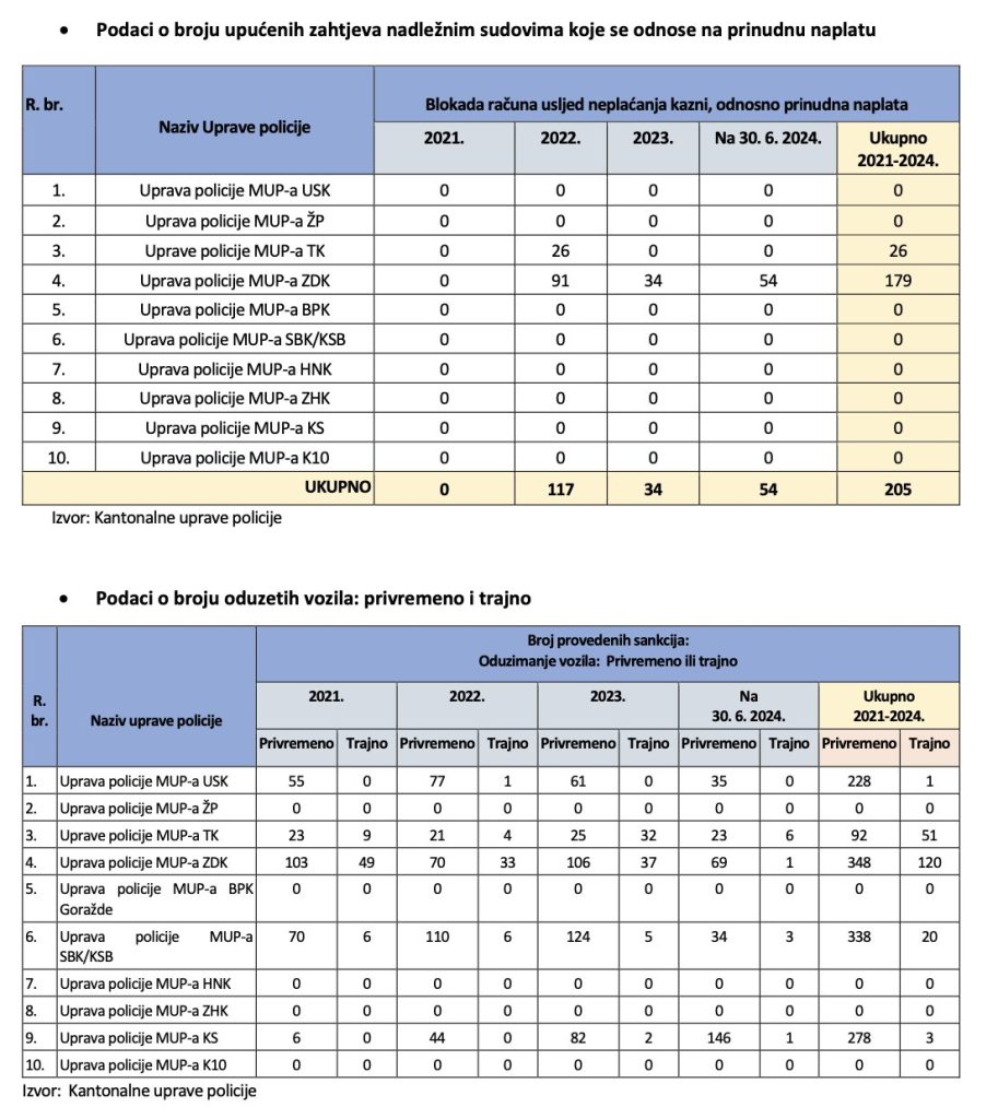U periodu 2021–2024, samo tri kantonalne uprave policije (Tuzlanski kanton, Zeničko-dobojski kanton i Kanton Sarajevo) su uputile zahtjeve za prinudnu naplatu kazni putem blokade računa.