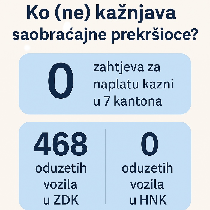 Uprkos hiljadama saobraćajnih prekršaja godišnje, sistem sankcionisanja u Federaciji BiH pokazuje ozbiljne slabosti. Kazne masovno zastarijevaju, računi se rijetko blokiraju, a vozila gotovo da se i ne oduzimaju. Revizija razotkriva da mnoge policijske uprave godinama ne koriste zakonske mehanizme prinude, dok institucije nemaju ni tačne podatke o broju prekršaja i naplaćenim kaznama. U nekim kantonima – prekršioci mogu mirno spavati, jer je kažnjavanje više izuzetak nego pravilo.