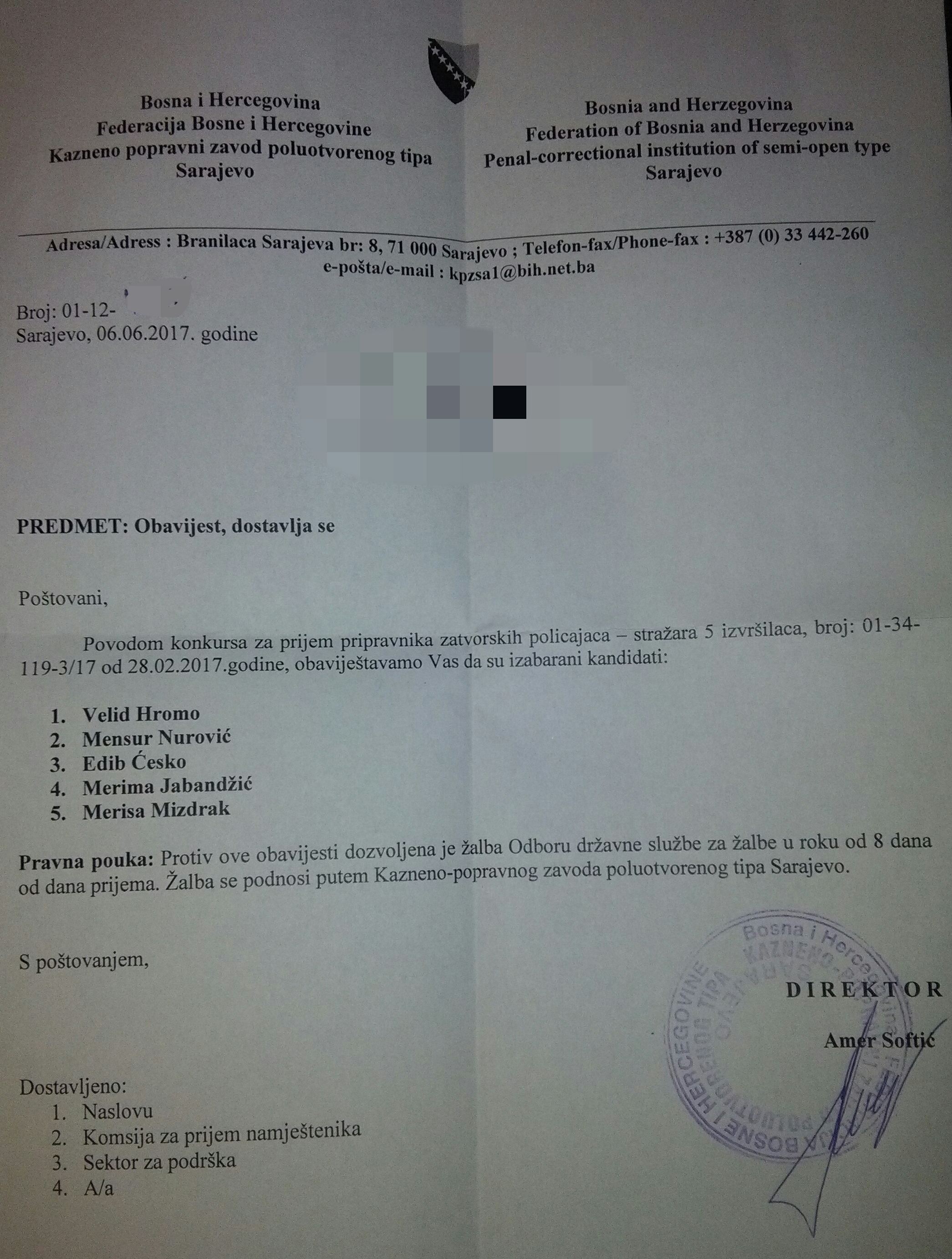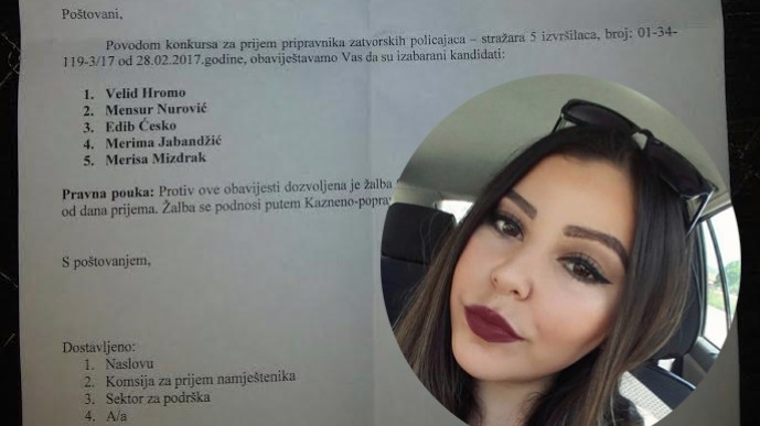 “Rekli su da će primiti dvije ženske pripravnice. Merima nije zadovoljila gotovo nijedan kriterijum koji je bio javan, a šta su privatno pričali to ne znam. Na početku nisam ni skontala ko je dok ona nije došla u službenom autu. Uopšte nisam mogla da povežem da se direktor zatvora u Zenici preziva isto kao i ona. Odmah mi je bilo jasno da bi ona mogla biti primljena. Čim smo saznali njeno prezime, mi djevojke smo se demoralisale”, iskrena je naša sagovornica, čije je ime poznato redakciji.