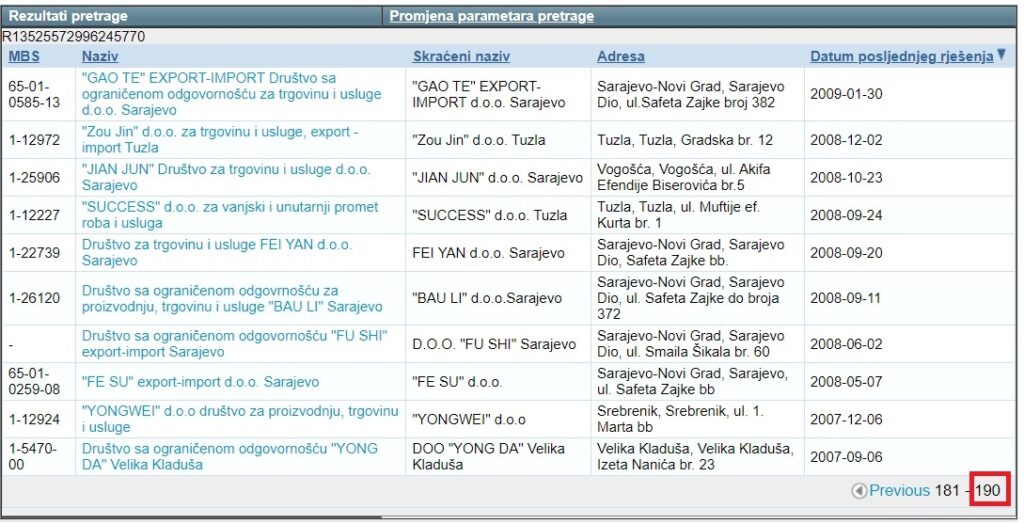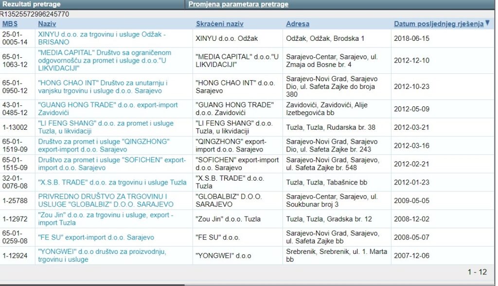 Prema informacijama koje pruža sudski Registar poslovnih subjekata na području FbiH, od 2007. godine do danas registrovano je čak 190 kineskih poslovnih subjekata. Napomene radi, ovo su podaci koje su ustanovili zaključno s 22. januarom, s obzirom na to da se oni s vremena na vrijeme brišu ili dopunjavaju iz ove baze podataka. S druge strane, tek 12 poslovnih subjekata, čiji su osnivači kineski državljani, brisano je iz Registra poslovnih subjekata u navedenom periodu.
