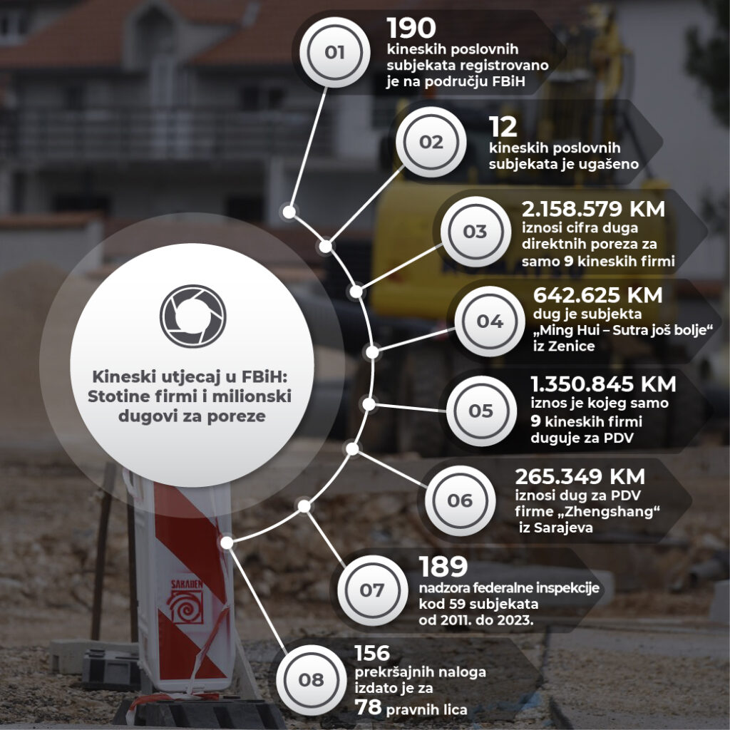Također, niz kineskih firmi koje su registrovane na području FBiH porezni su dužnici po osnovu PDV-a, što potvrđuje spisak dužnika Uprave za indirektno oporezivanje BiH.
