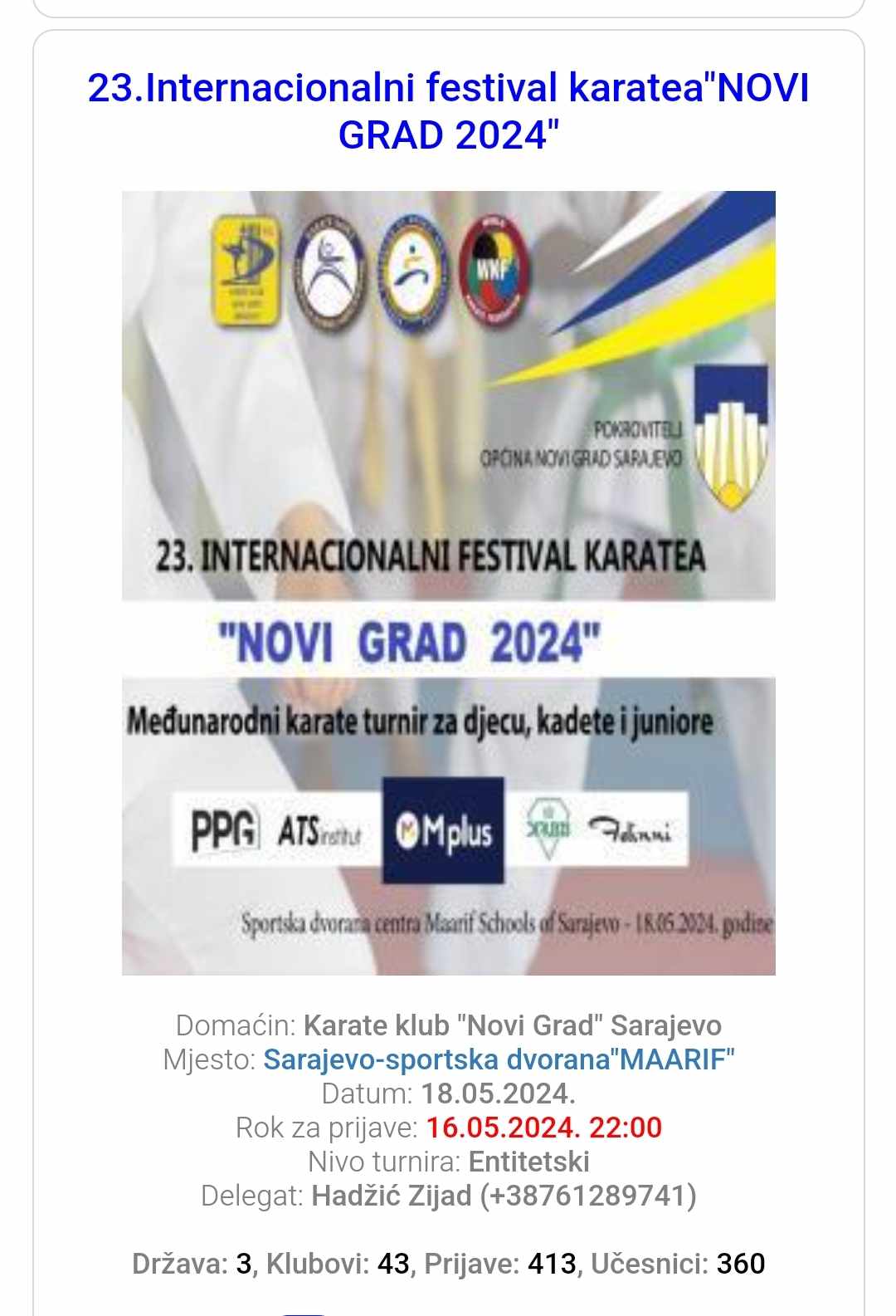 U subotu 18.05.2024.godine smo nastupali na 23.Internacionalnom festivalu karatea “NOVI GRAD 2024” u Sarajevu. Turnir je okupio 3 države 43 kluba sa 413 prijava i 359 učesnika. Upućujemo iskrene čestitke za organizaciju i gostoprimstvo karate klubu *Novi Grad* Sarajevo.