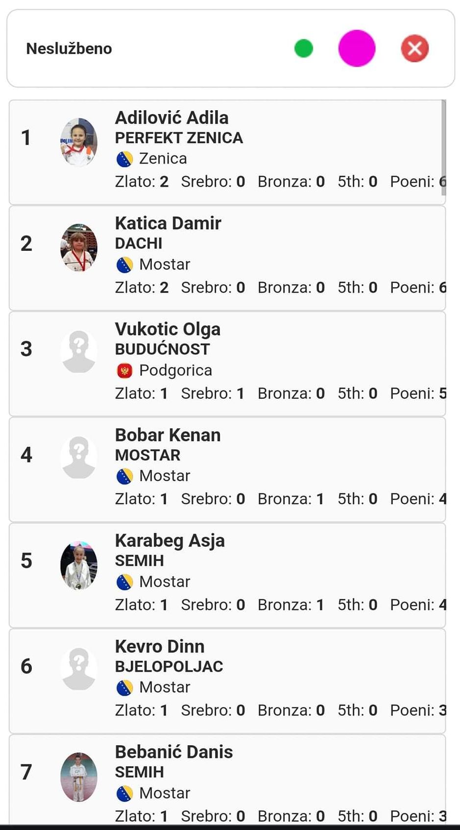 Adilović Adila je osvojila dva prva mjesta i dvije zlatne medalje u kategorijama kate djevojčice 9 godina i 10 godina oranž pojas. Sa osvojene dvije zlatne medalje je zauzela visoko prvo mjesto kao najuspješnija takmičarka turnira u neslužbenim kategorijama.