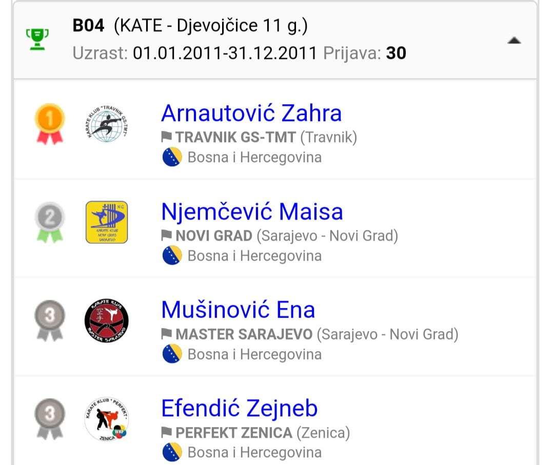 Federalno prvenstvo je okupilo izuzetno kvalitetne i jake takmičare, te smo doživjeli ogromno iskustvo, sabrali smo utiske i napravili planove za daljnji rad. Naša takmičarka Zejneb Efendić je ostvarila četiri pobjede u najmnogobrojnijoj i najkvalitetnijoj kategoriji djevojčice 11 godina. U navedenoj kategoriji je bilo 30 takmičarki. Naša zlatna Zejneb Efendić je osvojila 3.mjesto i bronzanu medalju. Izuzetno se ponosimo našom djecom, a posebno našom Zejneb, koja je pokazala i dokazala svoju zrelost, fizičku i psihičku snagu, te izuzetnu koncentraciju, kaže trener Nermin Bošnjak.