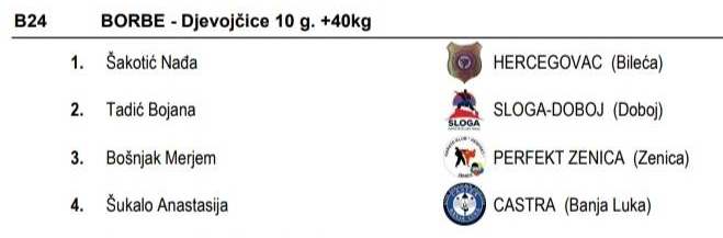 Naša perfektanka MERJEM BOŠNJAK je zauzela svoje mjesto na osnovu najvećih ostvarenih rezultata u kategoriji djevojčice 10 godina 40 + kg i to :