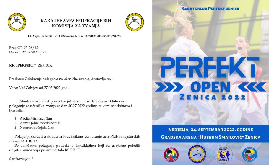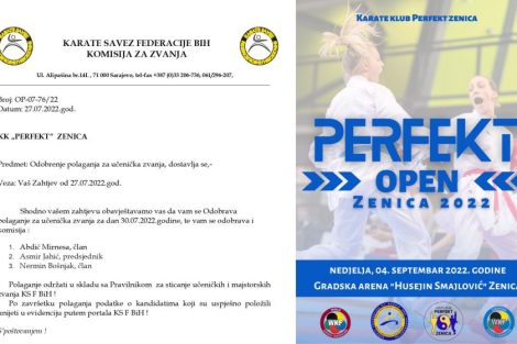 Pored najavljenog polaganja za učenička zvanja, u Karate klubu Perfekt su u toku pripreme za karate turnir u Zenici “PERFEKT OPEN ZENICA 2022” koji je planiran za nedjelju 4. septembra u Gradskoj areni “Husejin Smajlović” Zenica.