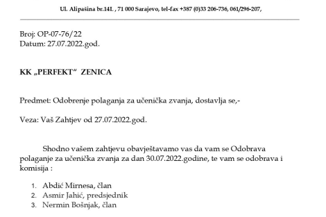 KK Perfekt Zenica nakon veoma uspješnog početka godine ove subote organizuje polaganje za prva i veća karate zvanja (pojaseve). Polaganje za zvanja će biti održano u OŠ “Meša Selimović” u 9h, 30. jula.