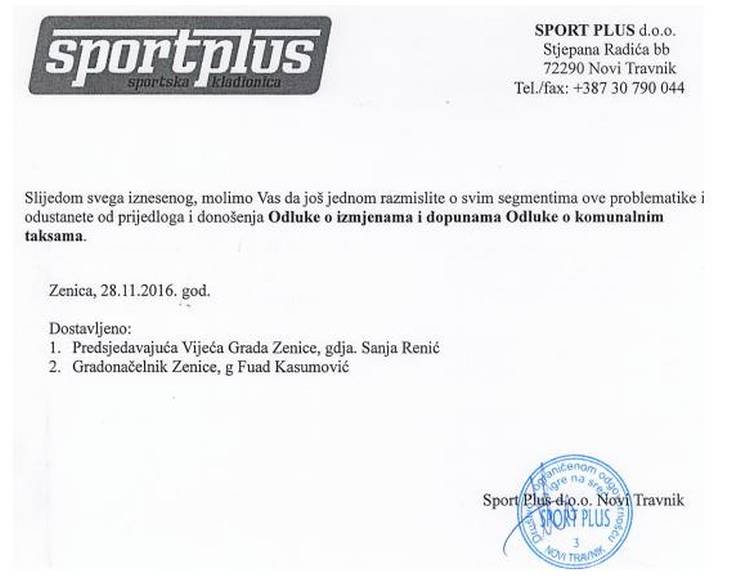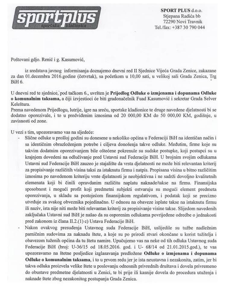 Kasumović je, na LINKU OVDJE, pojasnio svoje namjere oko uvođenja komunalne takse. Naš portal saznaje da su, nakon njegovog oglašavanja u javnosti, reagovali iz (najmanje) jedne kladionice, uputivši Kasumoviću i predsjedavajućoj Gradskog vijeća Sanji Renić pismo u kojem ih upozoravaju da ne usvajaju takvu odluku, jer su identični pokušaji ranije “pali” na sudovima u FBiH, te da su općinske administracije morale platiti odđtetu zbog nezakonitih odluka.