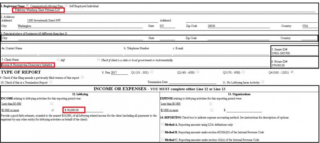 U cilju kontaktiranja američkog Senata te pokušaju ostvarivanja uticaja na odluke koje donosi, angažovana je potpuno nepoznata nevladina organizacija “Bosnia & Herzegovina Democracy Initiative” (BHDI), koja je potom angažovala lobističku kuću Pillsbury Winthrop Shaw Pittman LLP sa sjedištem u Washingtonu, a cijela akcija odvija se pod pokroviteljstvom kladioničarskog lobija iz susjedne Hrvatske.