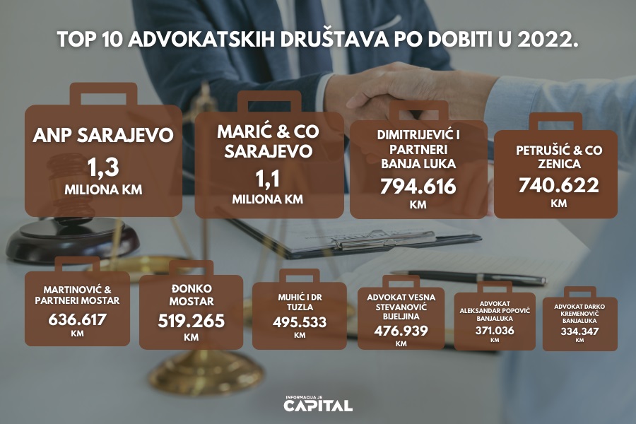 Od deset najuspješnijih advokatskih kuća, šest je sa sjedištem u Federaciji BiH, a četiri u Republici Srpskoj. Listu predvodi Advokatsko društvo “Ademović, Nožica i partneri” (ANP) iz Sarajeva koje je prošle godine ostvarilo dobit u iznosu od 1.302.401 KM.