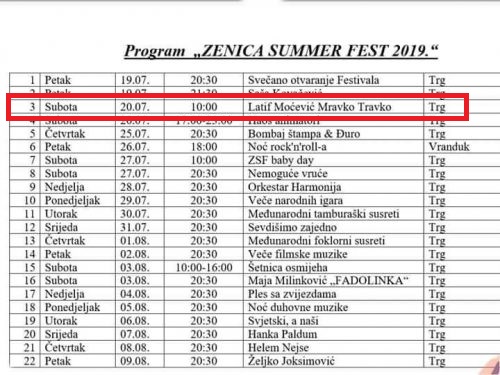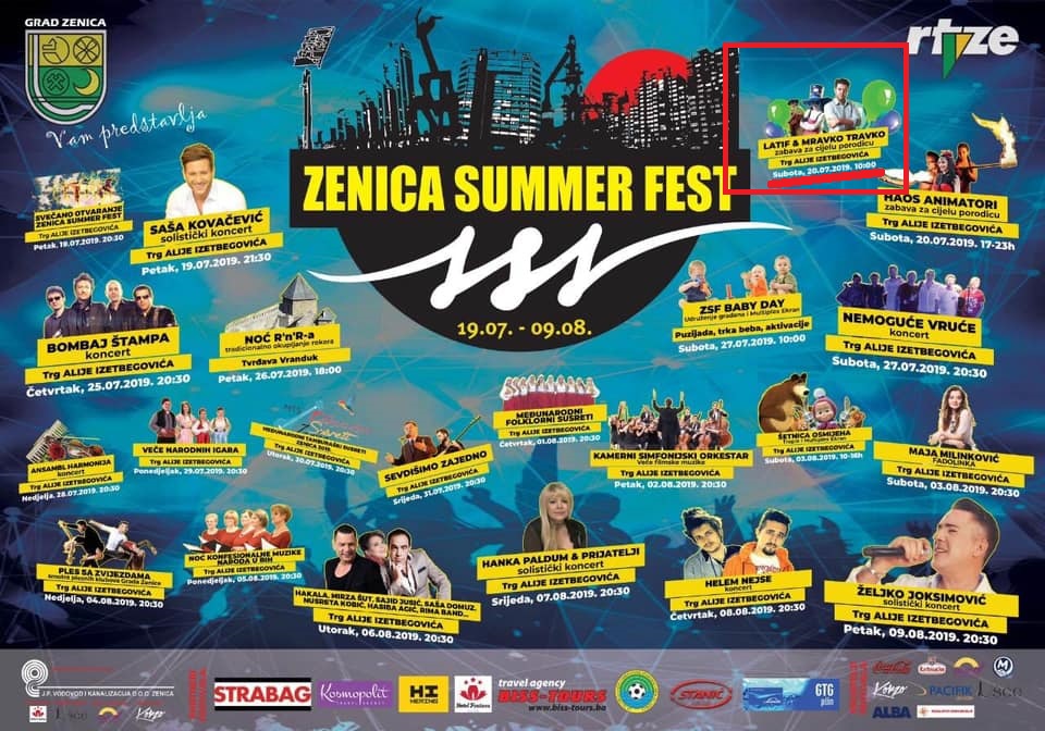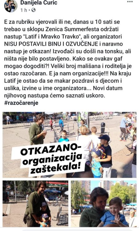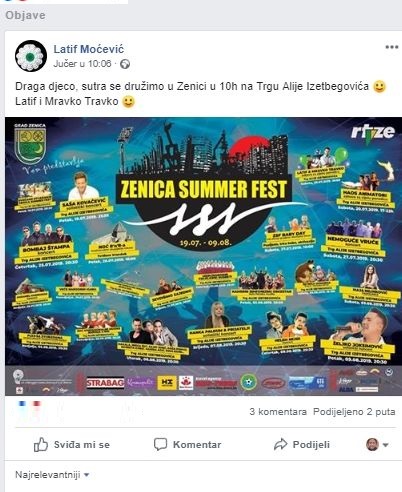 Ko je “podbacio”? Latifa Močevića prvo razočarali organizatori, a onda obrisao post i najavio novi nastup – Na društvenim mrežama danas je “osvanula” informacija o otkazivanju koncerta i nastupa Latifa Močevića, drugog učesnika Zenica Ssummer Festa 2019. popularni izvođač numera za najmlađe i sjajan animator dječice za zabavu prema svim najavama jutros je koncert trebao održati u 10 sati. Ali.