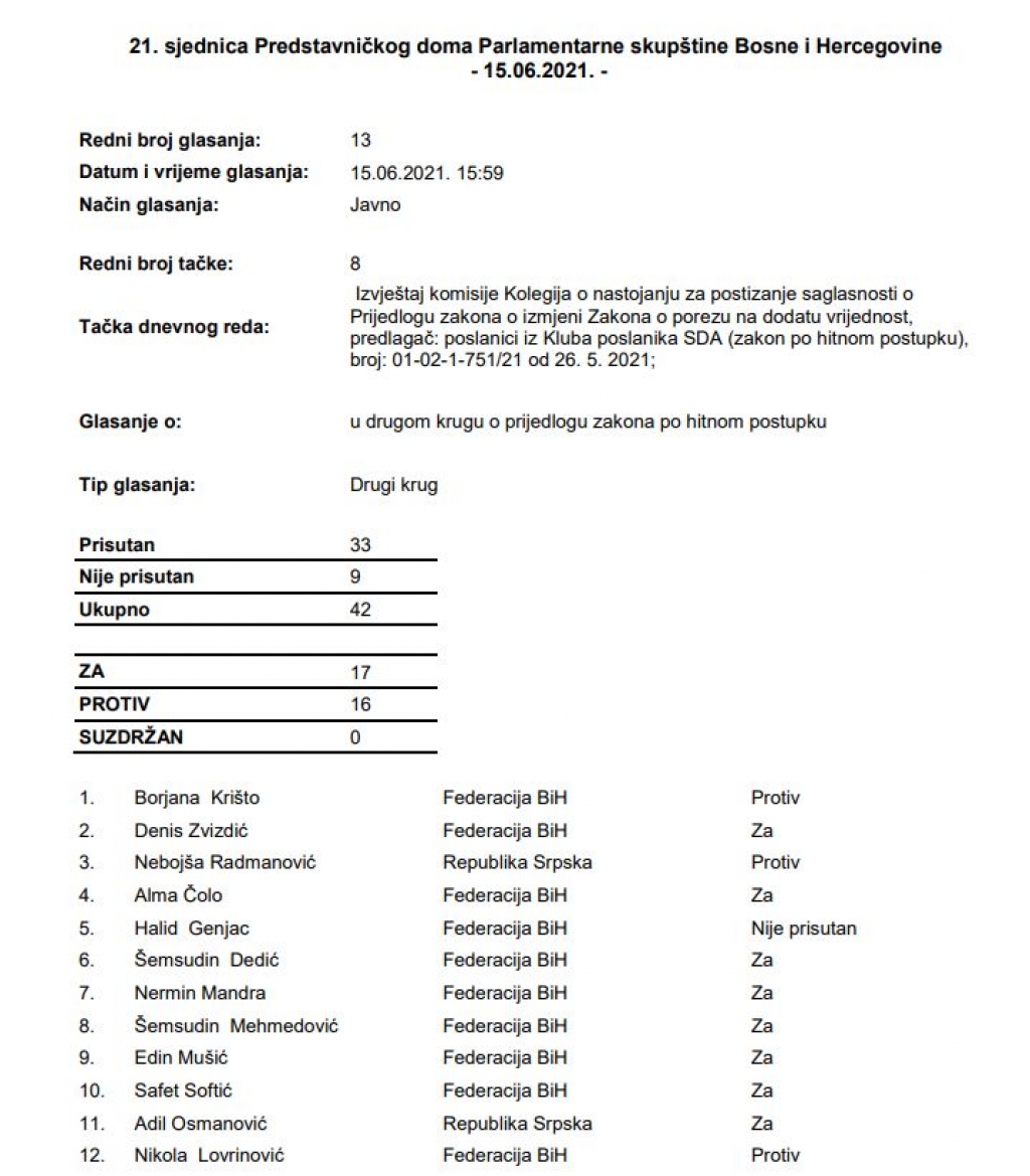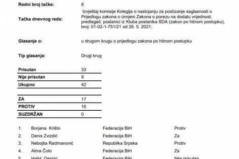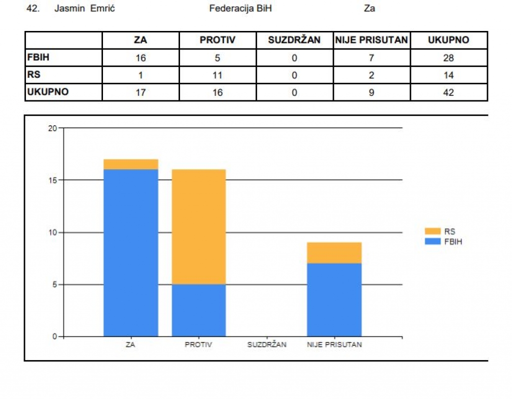 Prema rezultatima glasanja koji su objavljeni na web stranici Parlamentarne skupštine BiH, protiv su bili zastupnici Borjana Krišto, Nikola Lovrinović, Darijana Filipović, Mijo Matanović i Predrag Kožul, iz HDZ-a BiH.
