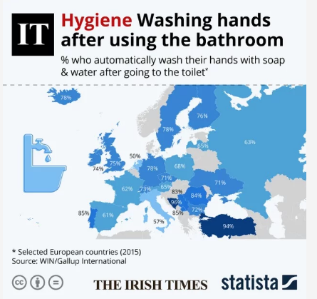 No, čini se da se te higijenske navike ne pridržavaju bas svi Evropljani. Studija Gallup Internationala iz 2015. godine, suprotno očekivanjima, pokazala je kako se ruke manje peru u razvijenijim sredinama.