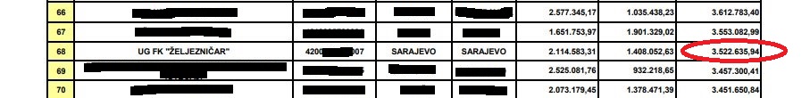 U odnosu na mjesec mart na listi dužnika nema Univerzitetsko-sportskog društva Bosna (tada evidentiran dug 264.821,33 KM), ali zato se sada “pojavio” obveznik USD Bosna koji je dužan 4.713.925,94 KM. Kada se pogleda arhiva dužnika, do ove cifre se dolazi kada se saberu dugovi Univerzitetsko-sportskog društva Bosna (264.821,33 KM) i obveznika Bosna SD (4.449.104,61).