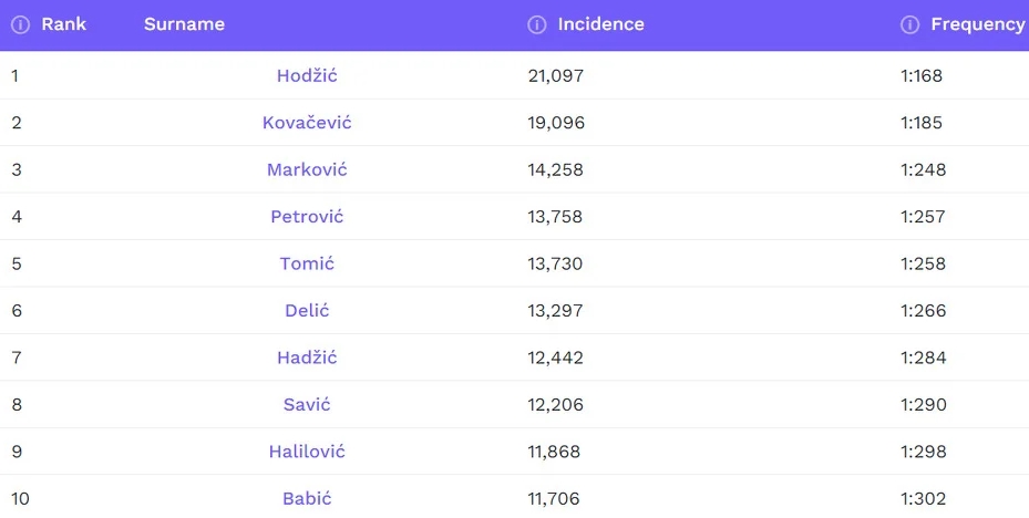 Na prvom mjestu je prezime Hodžić, koje nosi 21.097 ljudi, a slijede: Kovačević (19.096), Marković (14.258), Petrović (13.758), Tomić (13.730), Delić (13.297), Hadžić (12.442), Savić (12.206), Halilović (11.868) i Babić (11.706). Kompletnu listu prezimena u našoj zemlji možete pogledati ovdje.