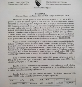 – Kako su sredstva Ministarstva civilnih poslova BiH isključivo u vezi s grantom, u 2023. godini je odlukom Vijeća ministara BiH Olimpijskom komitetu, savezu i klubovima olimpijaca dodijeljeno 187.500 KM – naveli su iz MCPBiH.