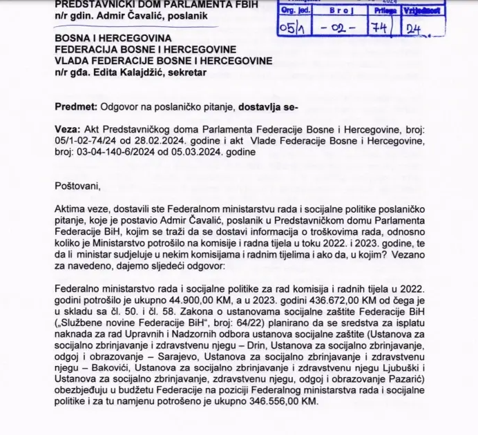 Federalni zastupnik Admir Čavalić (SBiH) u okviru zastupničkih pitanja zatražio je od federalnih ministarstava podatke koliko su potrošili na komisije i radna tijela u toku 2022. i 2023. godine te da li su ministri učestvovali u njihovom radu.