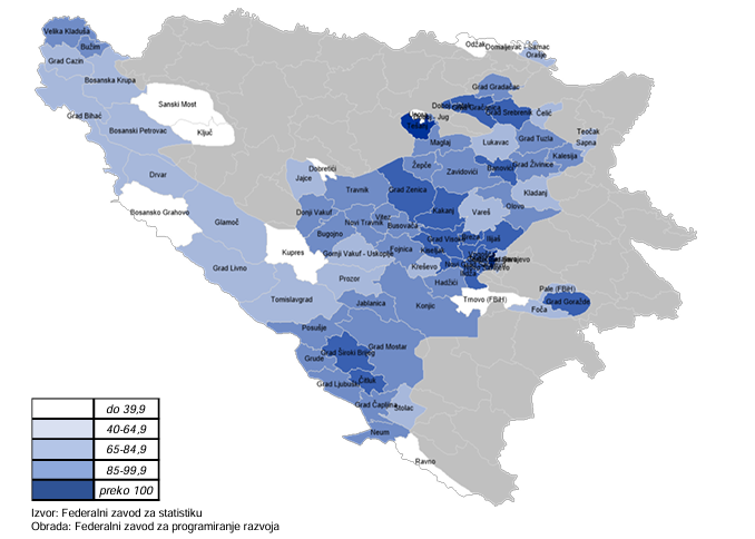 U grupi općina/gradova sa najmanjim brojem učenika na 1.000 stanovnika su po dvije iz Unsko-sanskog kantona, Posavskog kantona i Kantona 10.
