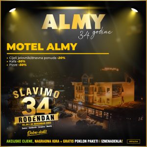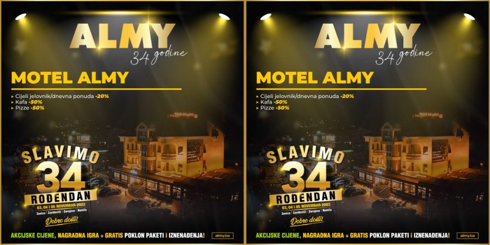 Ne prestajemo sa iznenađenjima za 34. rođendan kompanije ALMY! Pored 50 vaučera u vrijednosti od 30KM, u motelu Almy 03., 04, i 05. novembra, sva jela platite po 20% a kafu po 50% nižoj cijeni i počastite se našim nadaleko poznatim picama iz krušne peći i to u pola cijene!
