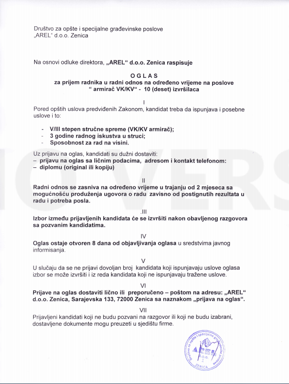 Kompanija AREL zapošljava deset armirača – Na osnovi odluke direktora, ,,AREL” d.o.o. Zenica raspisuje