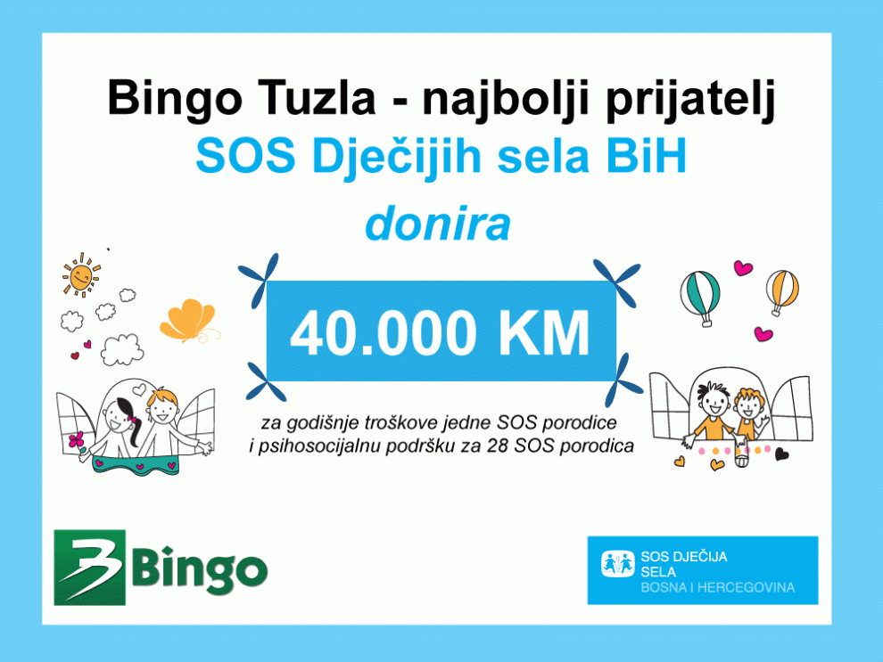Kompanija Bingo sedmu godinu podržava SOS Dječija sela BiH – donirana zaštitna oprema i 40.000 KM – Potpisivanjem ugovora o donaciji između Edina Ibrahimovića, izvršnog direktora za biznis operacije kompanije Bingo i Mirele Gruenther-Đečević, nacionalne direktorice SOS Dječijih sela BiH ozvaničen je nastavak sedmogodišnjeg prijateljstva između SOS Dječijih sela BiH i Binga. Donacija 40.000 KM je usmjerena na pokriće godišnjih troškova SOS porodice mame Amire, psihosocijalnu podršku fokusiranu na prevenciju akutne reakcije na stres kod djece i mladih u 28 SOS porodica, uz dodatnu donaciju zaštitnih maski, rukavica i dezinfekcijskih sredstva za ruke i površine.