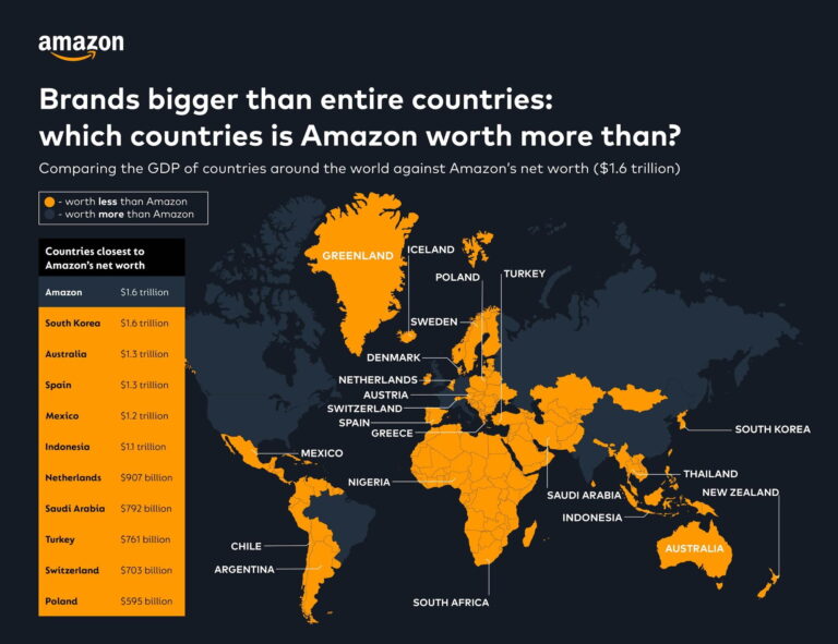 Amazonova tržišna kapitalizacija od 1,6 bilijuna dolara čini čini ga bogatijom od 92% zemalja svijeta. Amazonova vrijednost od 1,6 bilijuna dolara učinila bi je 14. najbogatijom ‘državom’ na svijetu. Gledajući ukupan prihod tvrtke i količinu osoblja zaposlenog u Amazonu, prihod po glavi stanovnika iznosio bi 351.531 američkih dolara, više nego bilo koja zemlja na svijetu.