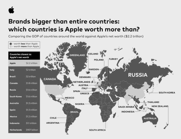 Prema istraživanju iz MacKeepera, najveće globalne tehnološke kompanije kontroliraju pozamašan dio svjetske privrede. Koliki je njihov globalni utjecaj slikovito pokazuje da ogromna neto vrijednost Applea u stvari znači da premašuje BDP zemalja poput Italije, Brazila, Kanade i Rusije. Zapravo postoji samo sedam zemalja na svijetu s višim BDP-om od Appleovih 2,2 bilijuna američkih dolara neto vrijednosti. Najveći globalni tehnološki div bogatiji od čak 96% svijeta. Apple bi da je država bio 8. najbogatija države na svijetu, ako dostigne neto vrijednost iznad 2,72 bilijuna dolara pretekao bi Francusku koja je sada na sedmog mjesta.