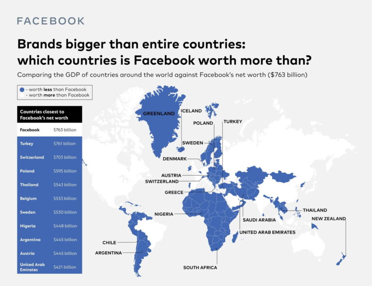 Iako Facebook nije među deset najvećih tvrtki na svijetu, s tržišnom kapitalizacijom od 763 milijarde dolara da je držav, bio bi bogatiji od Švicarske, Švedske i UAE zajedno. Div društvenih medija, u čijem su vlasništvu Instagram i Whatsapp, bio bi 26. najbogatija zemlja na svijetu.