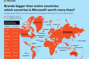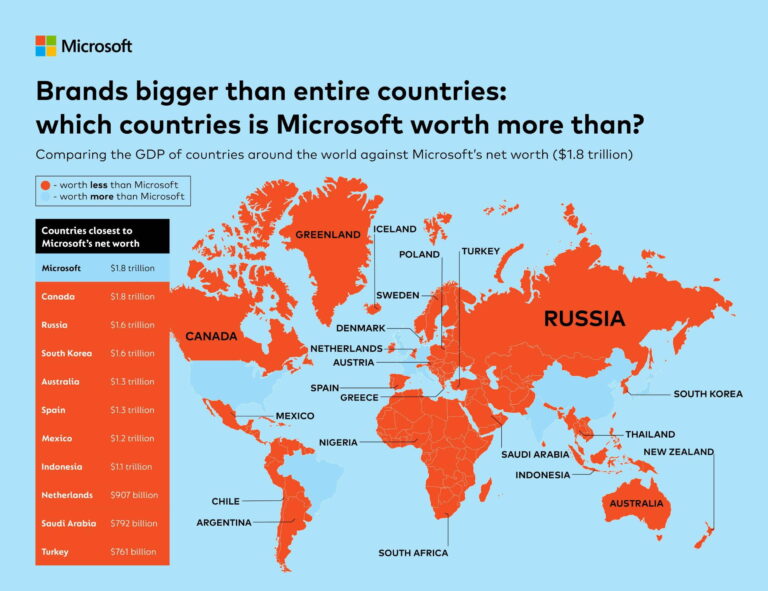 Microsoftova tržišna vrijednost od 1,8 bilijuna dolara svrstava je u treću najveću tvrtku na svijetu (nakon Applea i naftne i plinske kompanije Saudi Aramca). To njegovu vrijednost stavlja u ravan BDP-u Kanade, a bogatiji je od mnogih razvijenih privreda, uključujući Australiju, Španjolsku i Indoneziju. U stvari, i Apple i Microsoft imaju veću tržišnu vrijednost od svih srednje Europe i baltičkih zemalja zajedno.
