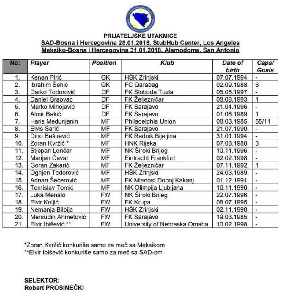 Konačan spisak igrača za utakmice u SAD-u – Bh reprezentativci će u četvrtak krenuti za Sjedinjene Američke Države gdje će odigrati dvije prijateljske utakmice.  Spisak reprezentativaca na koje selektor Robert Prosinečki računa za susrete sa SAD-om i Meksikom je objavljen na kraju ove vijesti.