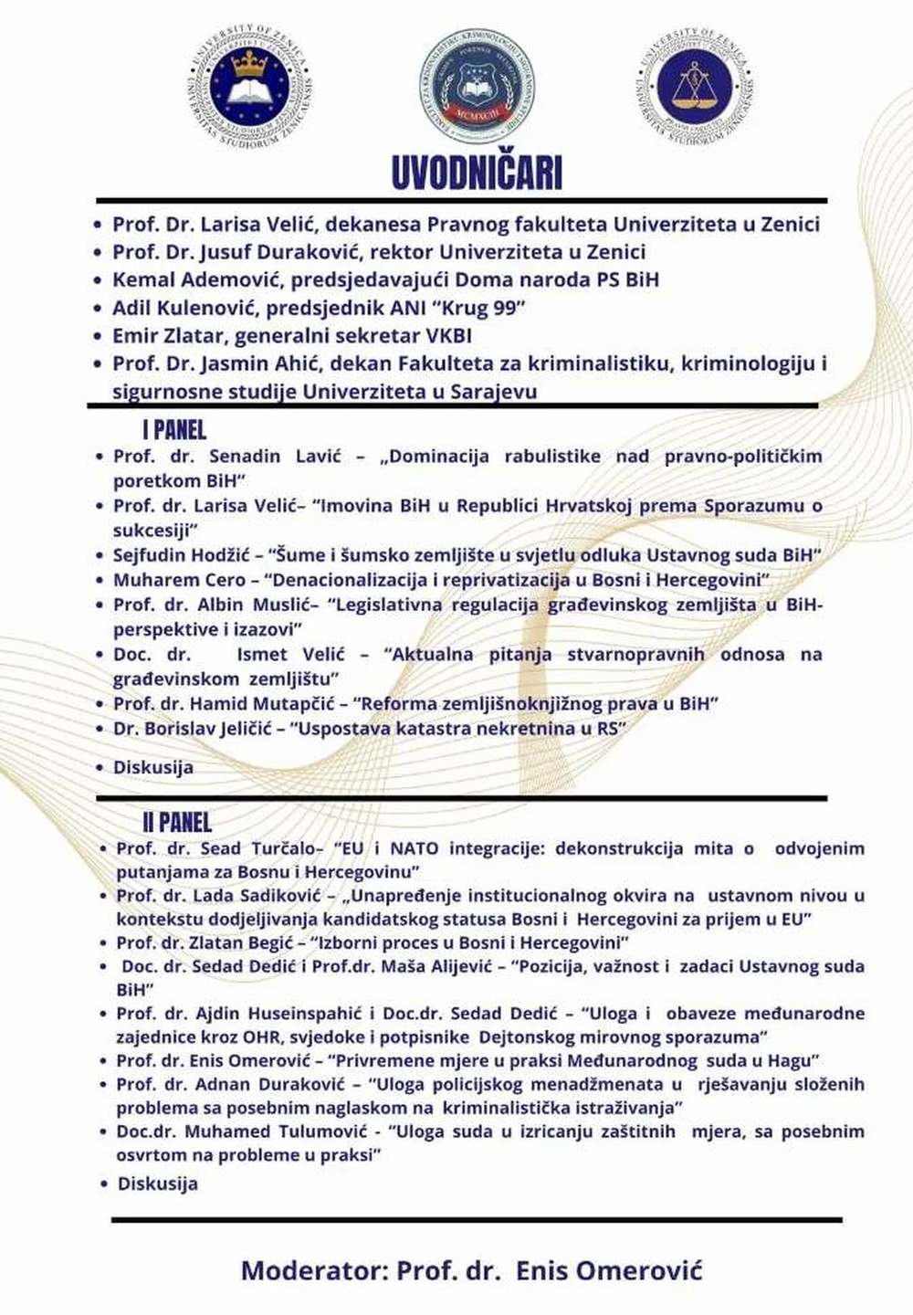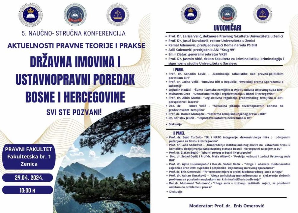 Pravni fakultet Univerziteta u Zenici u saradnji sa Fakultetom za kriminalistiku, kriminologiju i sigurnosne studije Univerziteta u Sarajevu organizuje naučno-stručnu konferenciju pod nazivom “Aktuelnosti pravne teorije i prakse: državna imovina i ustavnopravni poredak u Bosni i