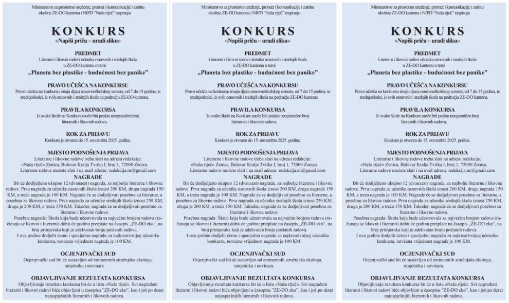 Otvoren je tradicionalni konkurs “Napiši priču-Uradi sliku” kojeg raspisuje NIPD “Naša riječ” u saradnji sa Ministarstvom za prostorno uređenje, promet i komunikacije i zaštitu okoline ZDK. Ovogodišnja tema konkursa je “Planeta bez plastike-budućnost bez panike”, a u skladu je sa motom “Beat plastic pollution” kojim su Ujedinjene nacije obilježile 05. juni, Svjetski dan zaštite okoline.