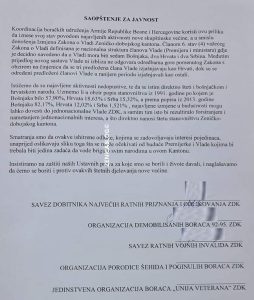 Koordinacija boračkih udruženja Armije Republike Bosne i Hercegovine koristi ovu priliku da iznese svoj stav povodom najavljenih aktivnosti nove skupštinske većine, a u smislu donošenja Izmjena Zakona o Vladi Zeničko-dobojskog kantona. Članom 6. stav (4) važećeg Zakona o Vladi definisana je nacionalna struktura članova Vlade (Premijera i ministara) gdje je decidno navedeno da u Vladi mora biti sedam Bošnjaka, dva Hrvata i dva Srbina. Međutim prijedlog novog sastava Vlade ni izbliza ne odgovara odredbama gore pomenutog Zakona s obzirom na činjenicu da se tri predložena člana Vlade izjašnjavaju kao Hrvati, dok su se određeni predloženi članovi Vlade u ranijem periodu izjašnjavali kao ostali.