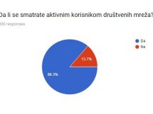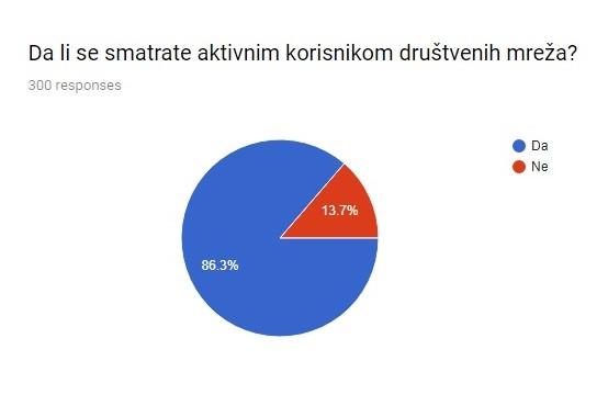 Kroz rezultate ankete saznajemo da je Facebook najpopularnija društvena mreža među našim sugrađanima (94,7%) zajedno sa Viberom (93%), dok 82% ispitanika koristi YouTube, a Instagram njih 68,3%. 86,3% ispitanika se smatra aktivnim korisnikom društvenih mreža, gdje njih 23,7% provodi više od 3 sata dnevno koristeći društvene mreže, a 28,3% do 2 sata.