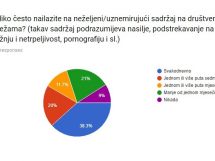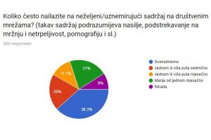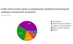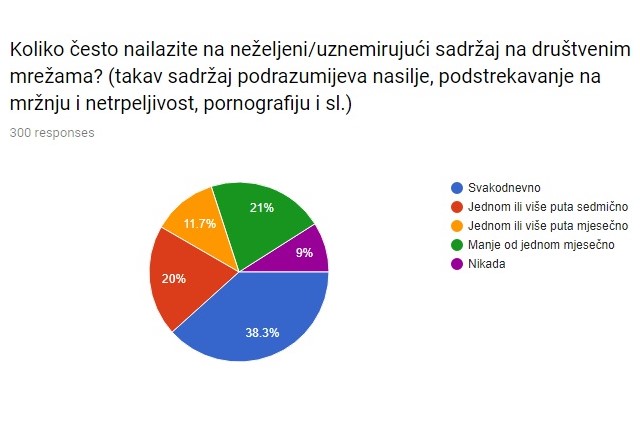 Kada je u pitanju neželjeni, odnosno uznemirujući sadržaj na društvenim mrežama (anketa navodi nasilje, podstrekavanje na mržnju i netrpeljivost, pornografiju i slično), korisnici se vrlo često sa njime susreću, čak 58,3% se susreće najmanje jednom ili više puta sedmično, ali je zabrinjavajuće da 41% anketiranih nikada ne koristi opcije za prijavljivanje neželjenih sadržaja koje društvene mreže pružaju ili tu opciju koriste veoma rijetko (manje od jednom mjesečno), njih 29,7 %.