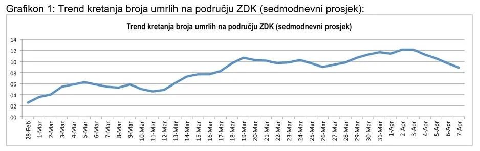 U grafikonima ističu da je broj umrlih od posljedica Covid-19 infekcije nakon početnog povećanja, 19. marta dostigao maksimum, da bi nakon toga uslijedio trend smanjenja broja umrlih do 26. marta, a zatim i novi porast do 02 aprila.