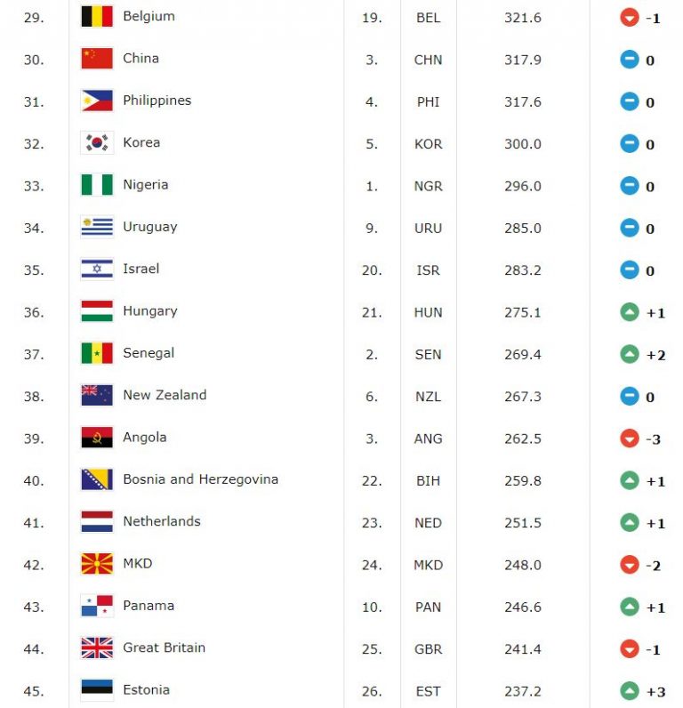 Na samom vrhu nije bilo promjena i dalje je neprikosnovena reprezentacija Sjedinjenih Američkih Država sa 793.7 poena, skoro 90 više od drugoplasirane Španije.