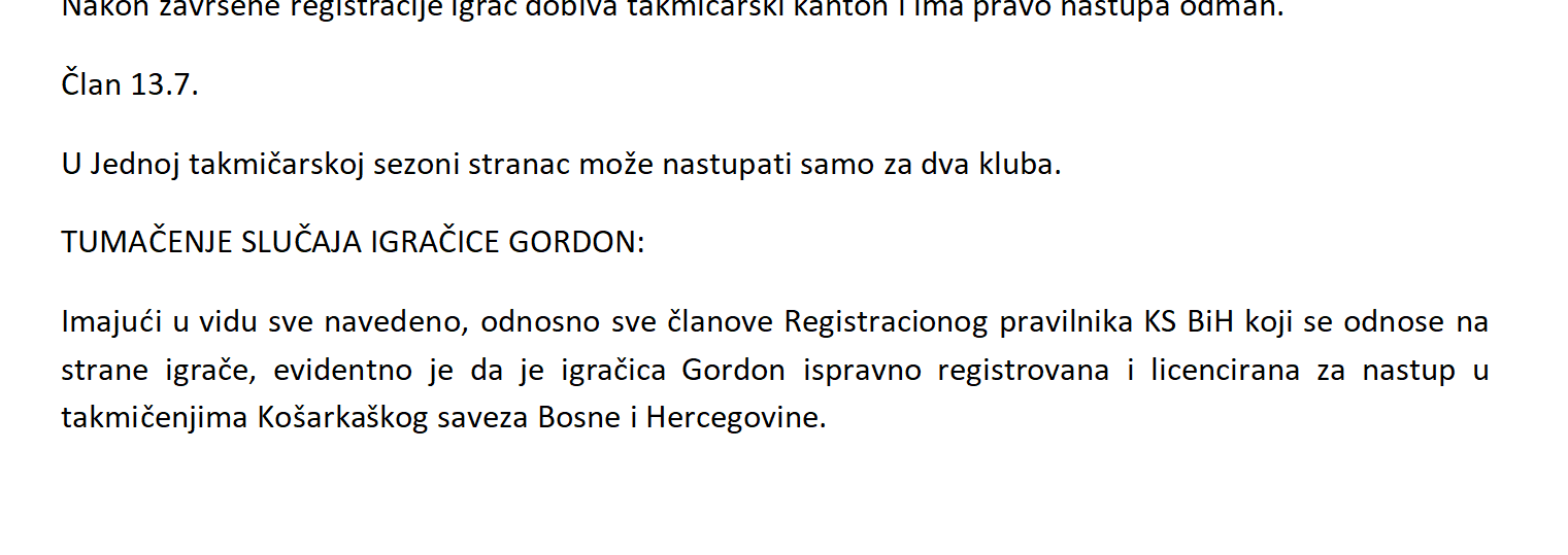 Imajući u vidu sve navedeno, odnosno sve članove Registracionog pravilnika KSBiH koji se odnose na strane igrače, evidentno je da je igračica Gordon ispravno registrovana i licencirana za nastup u takmičenjima Košarkaškog saveza Bosne i Hercegovine.