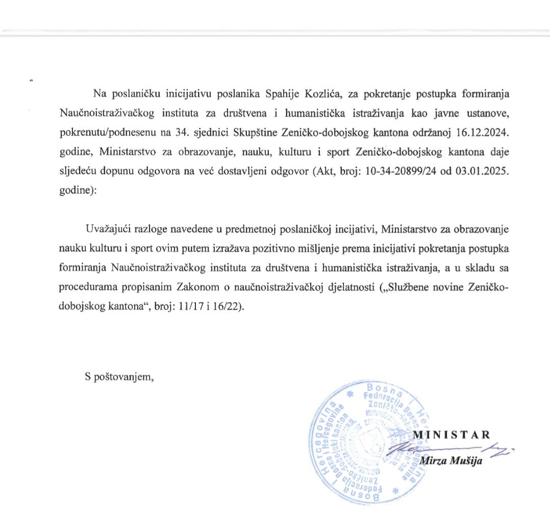 “Ministar Mušija, tačnije resorno ministarstvo je dalo pozitivno mišljenje na ovu inicijativu, pa očekujem skore aktivnosti na izradi elaborata i formiranje Instituta” istakao je Kozlić.