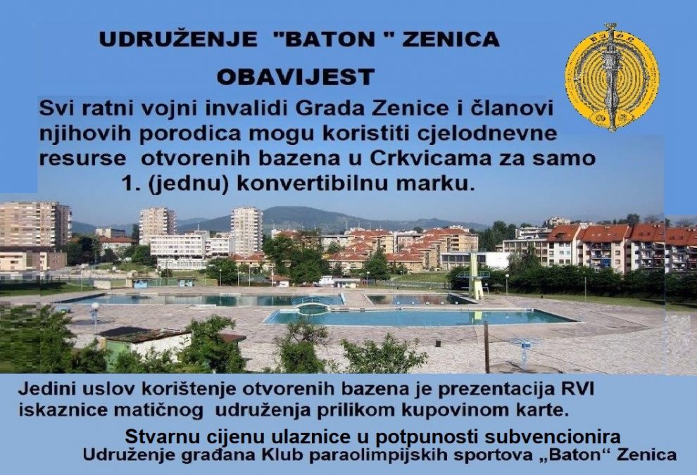 KPS “Baton” Zenica: uz RVI iskaznicu popust na bazenima u Crkvicama- Obavještavaju se svi ratni vojni invalidi Grada Zenice da je i ove godine Udruženje građana Klub paraolimpijskih sportova “Baton” Zenica sa Javnim preduzećem za  upravljanje sportskim terenima u Zenici potpisalo sporazum o  saradnji.