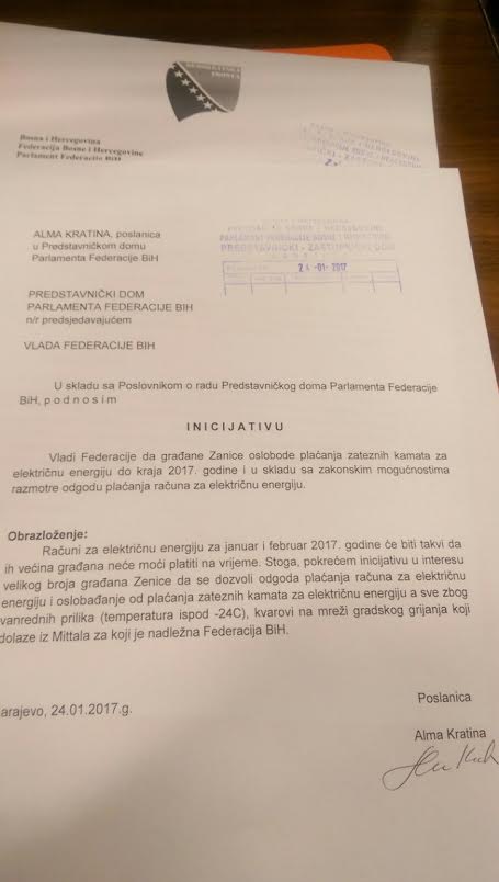“Na 16.Redovnoj sjednici Zastupnickog doma Parlamenta Federacije BiH, kao zastupnica, podnijela sam Inicijativu prema Vladi Federacije da građane Zenice oslobodi plaćanja zateznih kamata za el.energiju do kraja 2017. odnosno i u skladu sa zakonskim mogućnostim razmotri odgodu plaćanja računa za el. energiju. Obrazloženje uz podnesenu Inicijativu je više no argumentirano. Vanredne prilike (temperature ispod-24’C), kvarovi na gradskom grijanju koje dolazi iz Mittala i druge teške okolnosti koje dovode do nehumanih uslova u kojem u zimskom periodu žive građani Zenice, zahtjevaju angažman svih onih koji imaju svoj dio odgovornosti prema građanima.