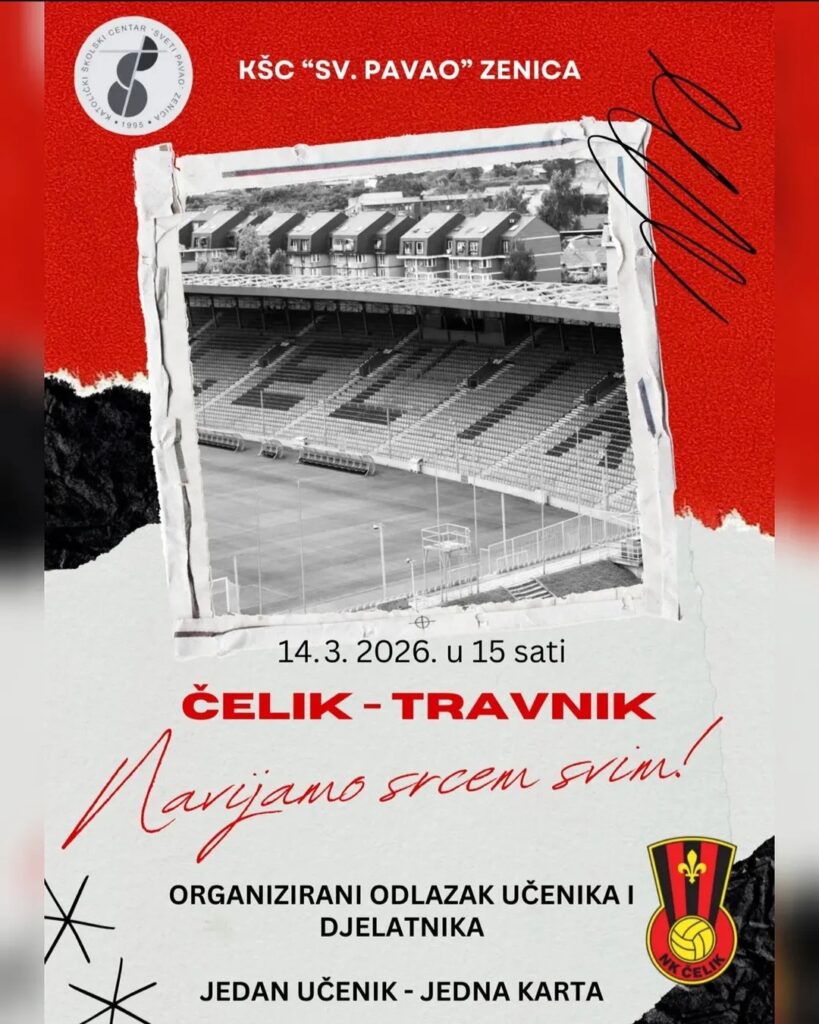 KŠC “Sveti Pavao”, Zenica prva je zenička škola koja poziva svoje učenike i djelatnike na utakmicu 14. kola Prve lige FBiH između Čelika i Travnika koja bi se trebala igrati u subotu, 14.3.