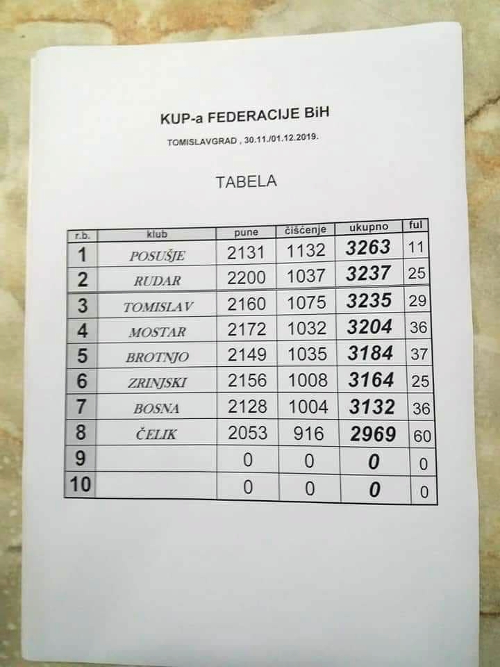 Proteklog vikenda, 30.11. i 01.12.2019.godine, u organizaciju Kuglaškog Saveza FBiH i domaćinstvo Kuglaškog Kluba Tomislav iz Tomislavgrada, održan je ekipni Kup Federacije BiH u klasičnom kuglanju, sezona 2019/2020. Na takmičenju je učestvovalo osam klubova, tri člana Premijer lige BiH: Posušje, Rudar Kakanj i Zrinjski Mostar, te pet članova Prve Federalne lige BiH: Bosna Visoko, Mostar, Brotnjo Čitluk, Čelik Zenica i domaćin Tomislav.