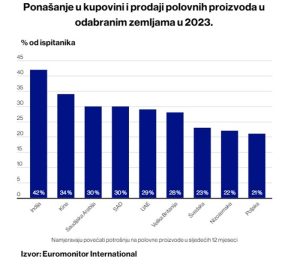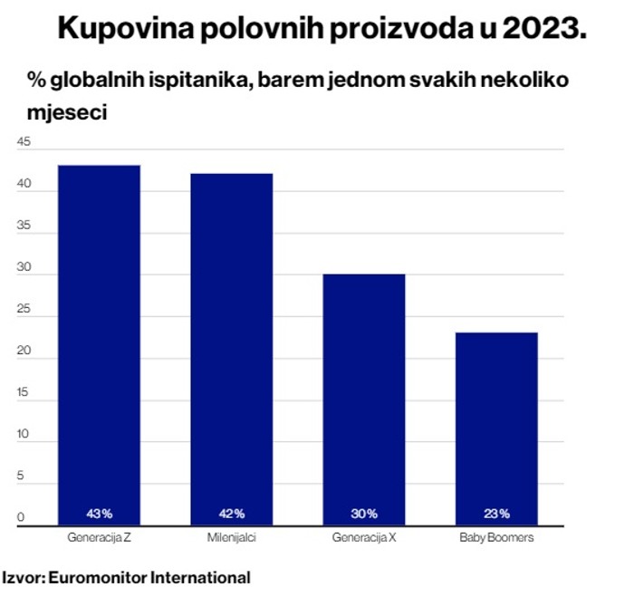 Euromonitor International Voice of the Consumer: Sustainability Survey 2023. pokazuje da 24 posto globalnih potrošača kupuje polovne proizvode kako bi vodilo održiviji život, dok 41 posto bira popravak pokvarenih proizvoda umjesto kupovine novih.