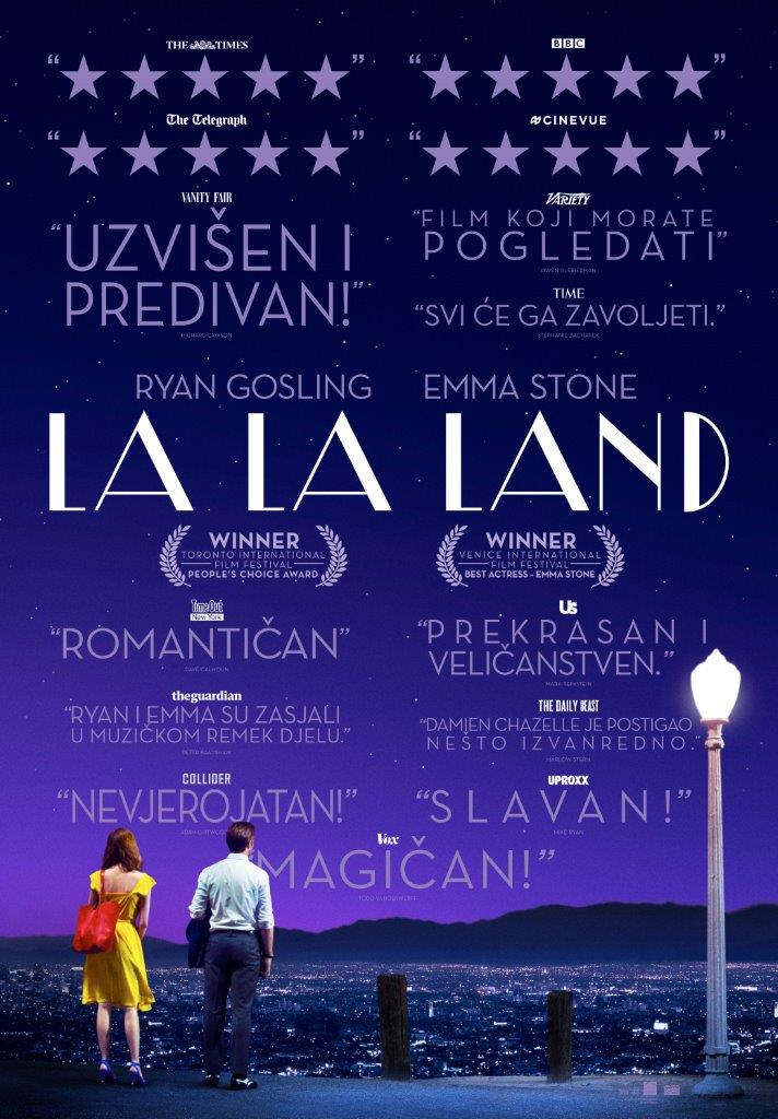 Dobitnik sedam Zlatnih globusa u kategorijama: Najbolji film, Najbolji reditelj, Najbolji scenarij, kao i za najbolje uloge. Omiljeni filmski ljubavni par, Emma Stone i Ryan Gosling ponovno zajedno u priči o dvoje sanjara koji pokušavaju uspjeti u Los Angelesu! Riječ je o iščekivanom filmu za Oscara nominiranog redatelja Damiena Chazellea, poznatog po sjajnom i hvaljenom filmu “Whiplash„.  U filmu Gosling igra jazz glazbenika koji se zaljubljuje u glumicu u usponu (Emma Stone), nakon čega uslijedi prava ljubavna romansa sa zapletom. Radnja filma smještena je u Los Angeles s naglaskom na atmosferu zlatne ere Hollywooda koja pršti romantikom kakva se ne viđa svaki dan.