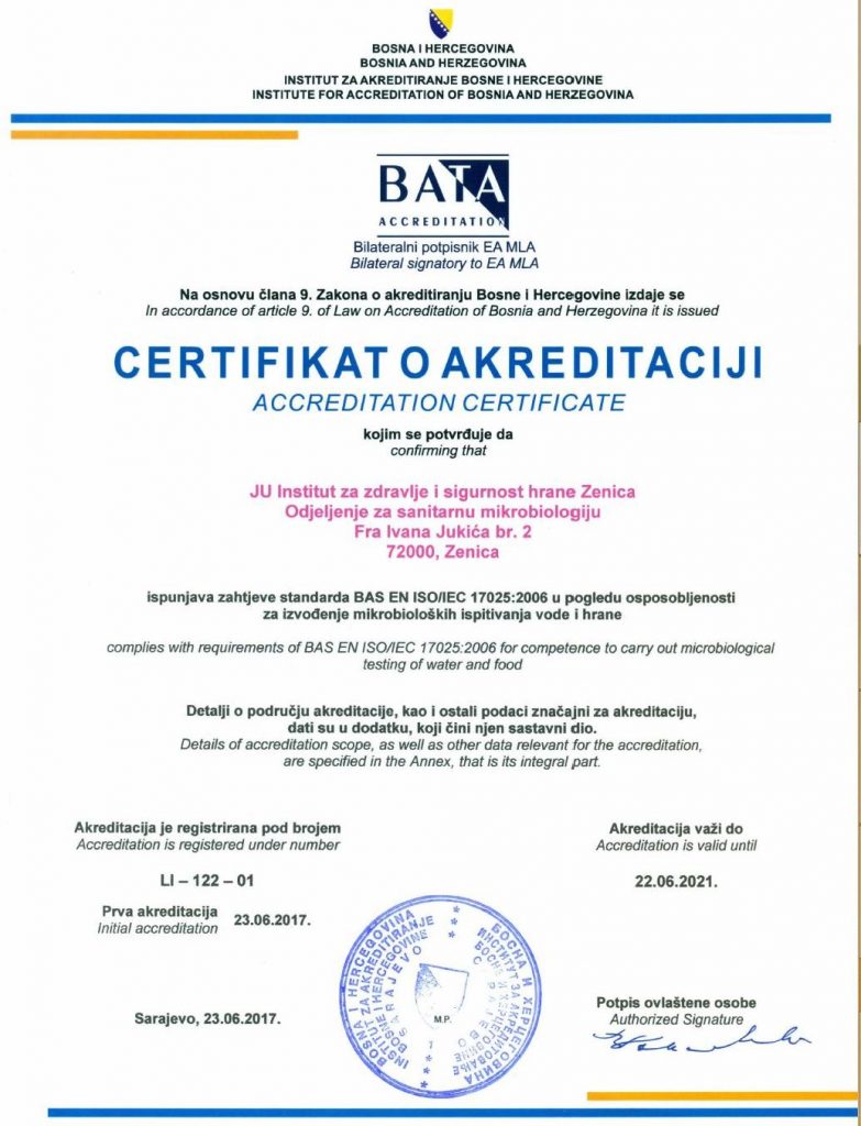 U okviru projekta osposobljavanja laboratorija Instituta za zdravlje i sigurnost hrane Zenica (INZ), uspješno je okončan proces akreditovanja Laboratorije za mikrobiologiju hrane i vode, a Certifikat o akreditaciji laboratorija po ISO 17025 standardu ovih dana je stigao u INZ. Institut je početkom ove godine realizovao projekat adaptacije i opremanja Odjeljenja za dijagnostiku bakterijskih i drugih zaraznih bolesti životinja, na lokaciji Metalurškog instituta “Kemal Kapetanović” Zenica.