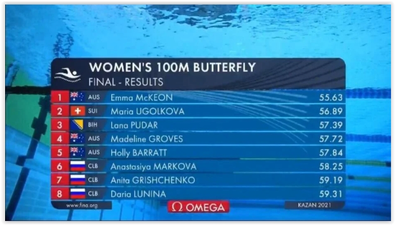 Zlatnu medalju je u ovoj disciplini osvojila Emma McKeon sa 55.63, dok je druga bila Maria Ugolkova.