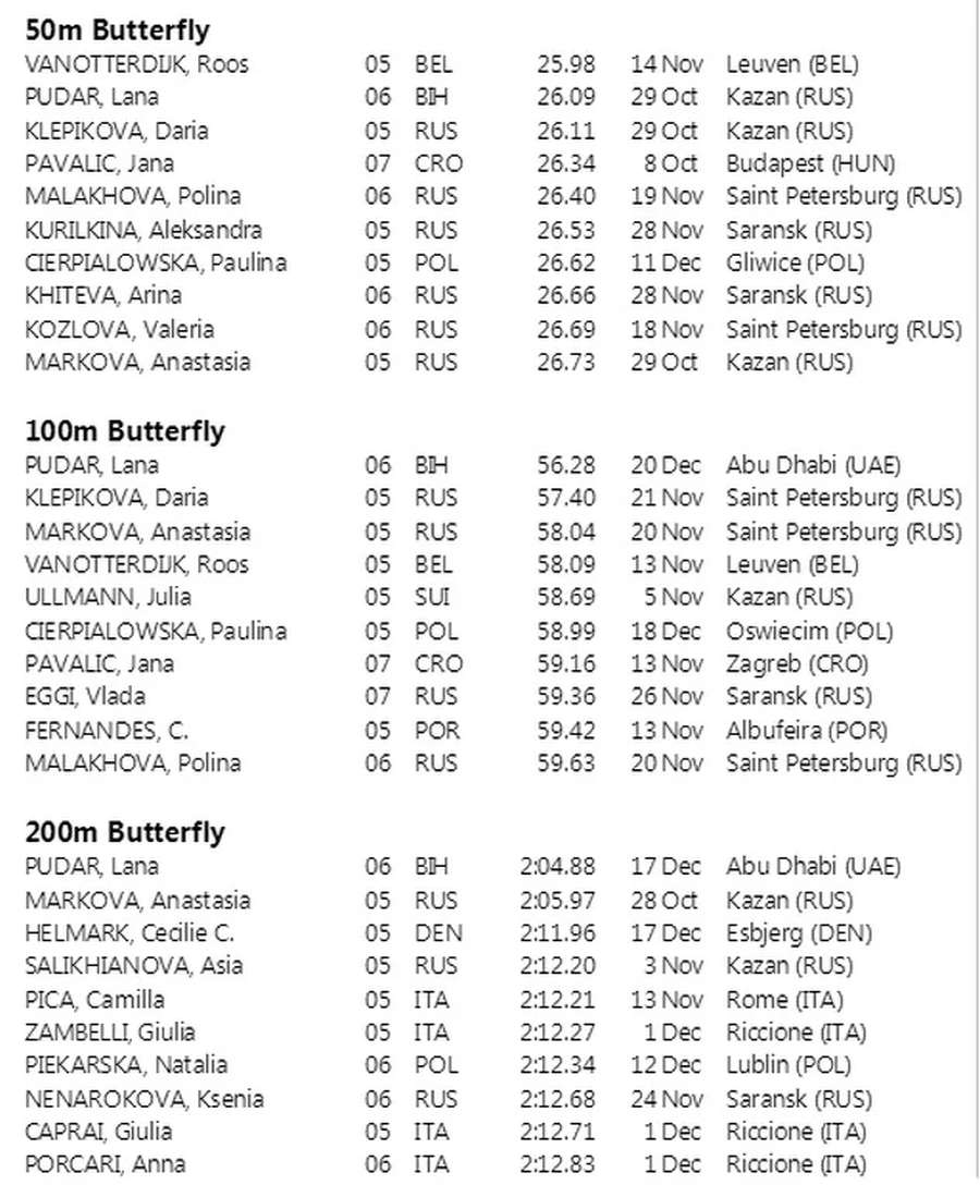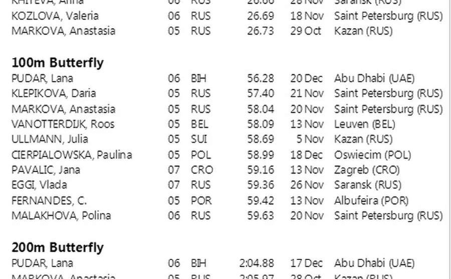Plivačica iz Mostara Lana Pudar (15) je najbolja juniorska plivačica u Evropi u dvije discipline, objavio je portal Swimranking nakon što je na završenom Svjetskom prvenstvu u plivanju u Abu Dhabiju osvojila bronzanu medalju za Bosnu i Hercegovinu. Lana se, po prikupljenim podacima iz Evropske plivačke federacije (LEN) i baze rezultata nacionalnih plivačkih saveza, našla na prvom mjestu juniorki u dvije discipline i među kremom evropskog plivanja. Po tim podacima je najbolja juniorska plivačica Evrope na 100 i 200 metara delfin te evropska juniorska rekorderka, dok je druga na 50 metara delfin.