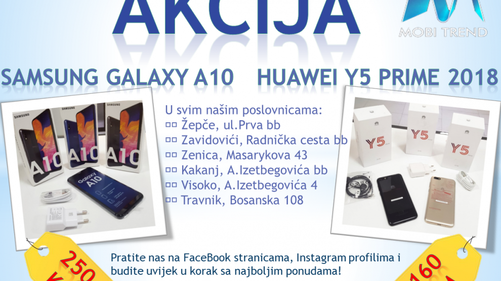 Mobi-Trend: akcija – Poštovani kupci, u toku je velika akcija na mobilne uređaje u svim našim Mobi-Trend poslovnicama. Ovog puta iz ponude izdvajamo Samsung galaxy A10, koji može biti Vaš za 250,00 KM i Huawei Y5 Prime 2018 po nevjerovatnoj cijeni od 160,00 KM. Posjetite nas na Vama...