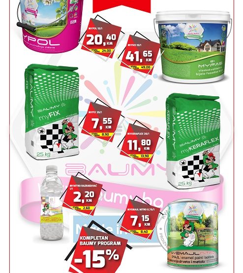 Vikend akcija u Bau centrima kompanije Almy – “Vikend akcija u Bau centrima kompanije Almy u Zenici, Zavidovićima i Nemili. Kompletan Baumy program snižen 15%. Akcija traje 08. i 09.02.2020. i važi samo za gotovinsko plaćanje. Trideset godina sa Vama, kompanija Almy!”